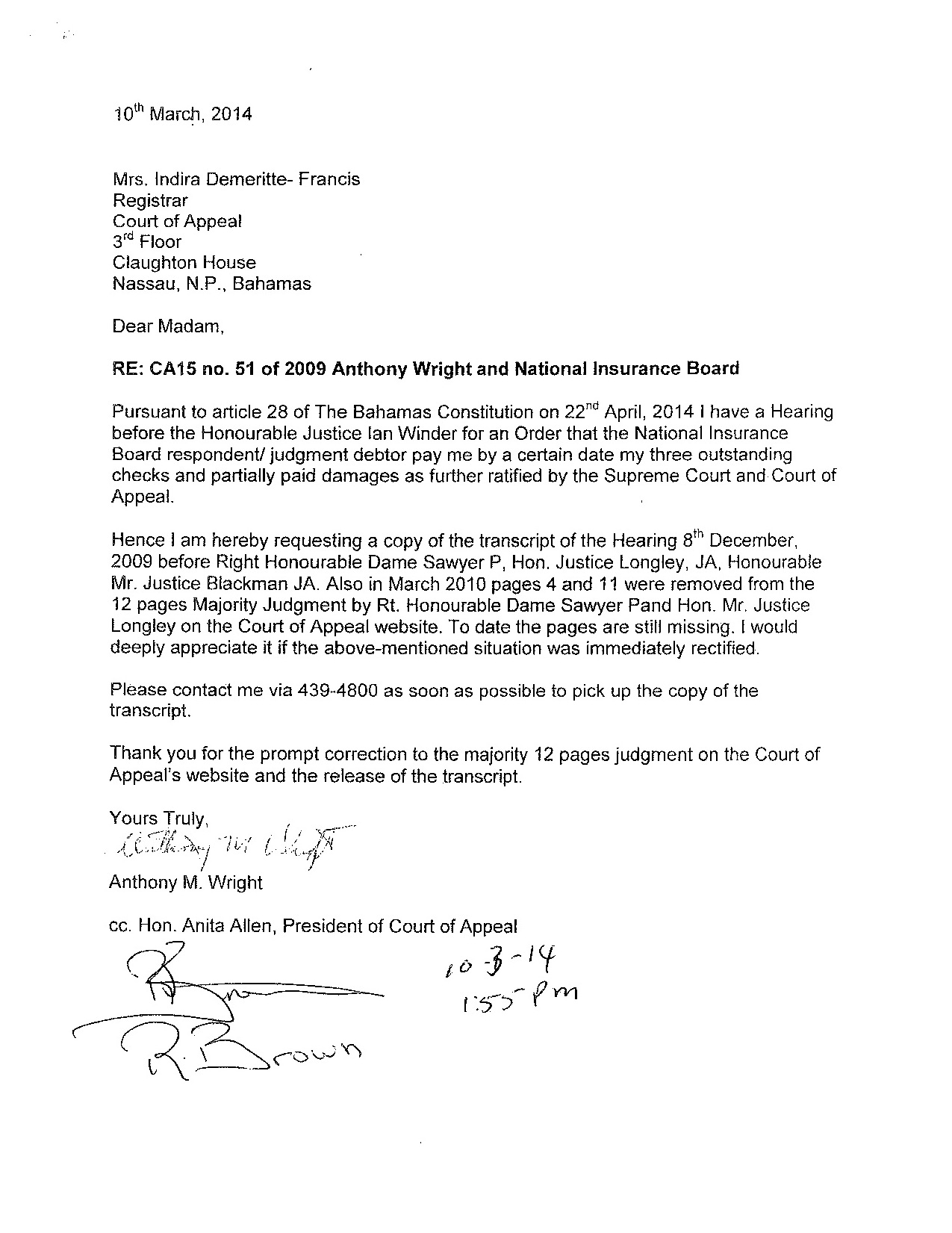 Attached are copies of two letters dated 10th March, 2014 from me to the Registrar of the Supreme Court, Mrs. Donna Newton and the Registrar of the Court of Appeal, Mrs. Indira Demeritte- Francis that are self-explanatory. There has been no response to the above- mentioned entitle requests.