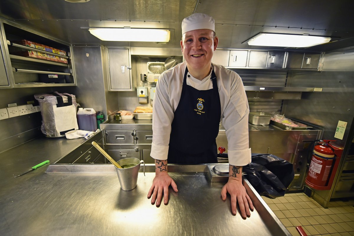 A chef preparing a curry inside the galley, where the ship’s food is prepared.
