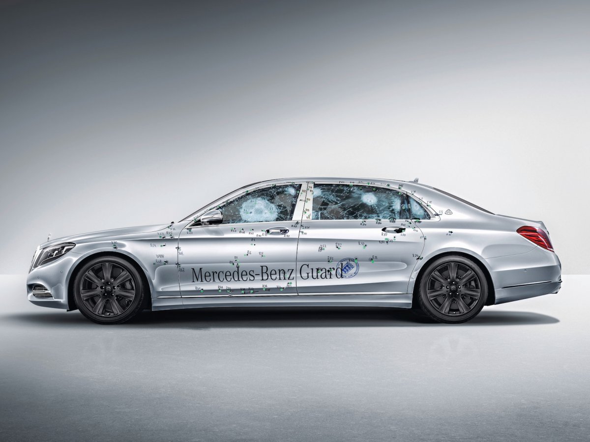Armored protection includes integrated steel protection panels inside the body along with overlapping protection panels in critical areas of the car. The Guard also features armored floors to protect occupants from bomb blasts. In addition, the ultra-thick laminated glass windows have been coated with polycarbonate on the inside to prevent splintering. According to Mercedes, the Pullman Guard is certified at resistance class VR9 and blast proof to comply with ERV2010 standards.