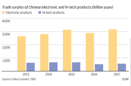 Lu of the Taiwan Institute of Economic Research said MIC2025 had not turned the tide for China, as its trade surplus for hi-tech products in 2017 fell from 2015, indicating that Chinese manufacturers’ reliance on foreign core technologies had grown.