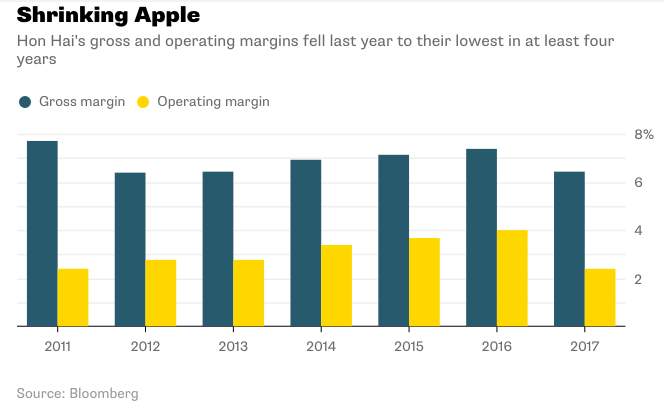 Hon Hai’s gross and operating margins fell last year to their lowest in at least four years