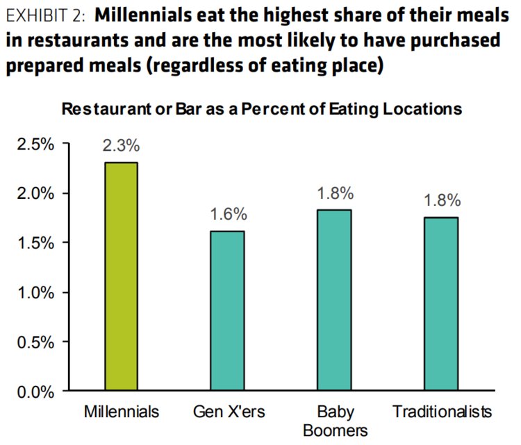 The chart shows that in a given month, millennials have 2.3% of their meals at a restaurant, which Bernstein estimates as roughly one trip every other week.