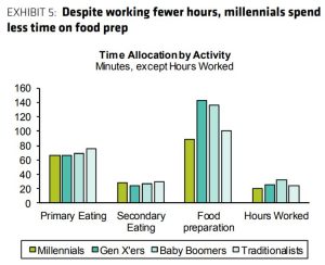 Bernstein found that even though millennials work fewer hours than older generations — including those who have retired — they spend the least amount of time on meal prep.