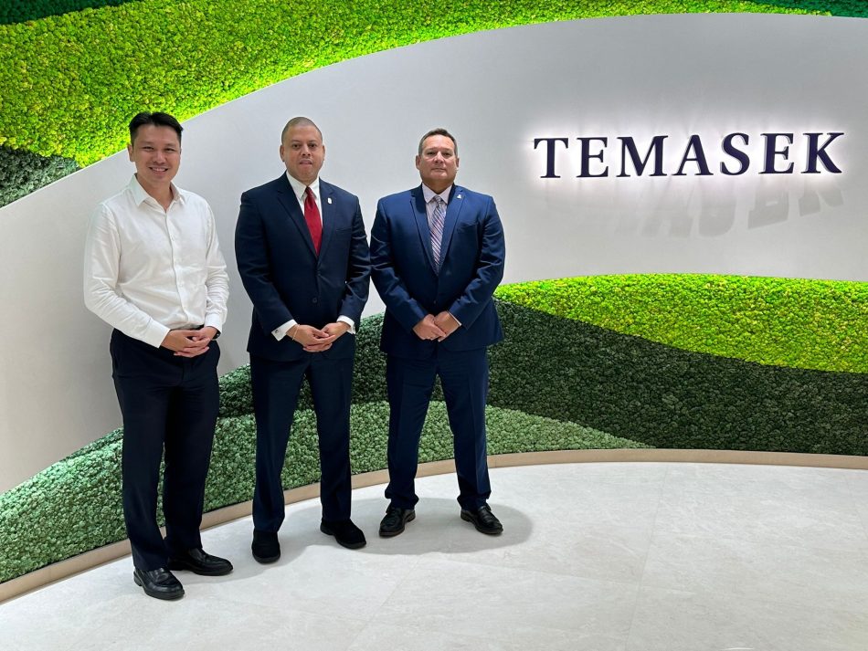 Minister for Financial Services & Commerce Hon. Andre Ebanks and Cayman Islands Government representative to Asia Gene DaCosta with Mr. Shawn Huang Wei Zhong, MP of Temasek, a Singaporean Sovereign Wealth Fund.