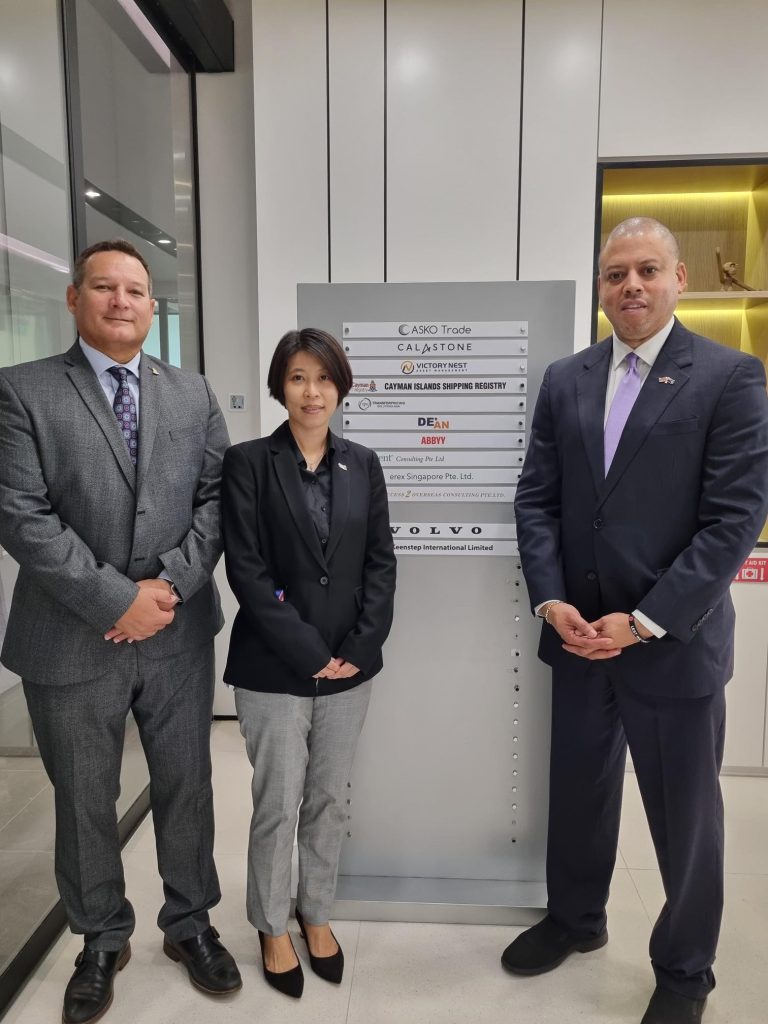 Minister for Financial Services & Commerce Hon. Andre Ebanks and CI Government representative to Asia Gene DaCosta with Evelyn Soon, Representative for the Cayman Islands Shipping Registry in Singapore.