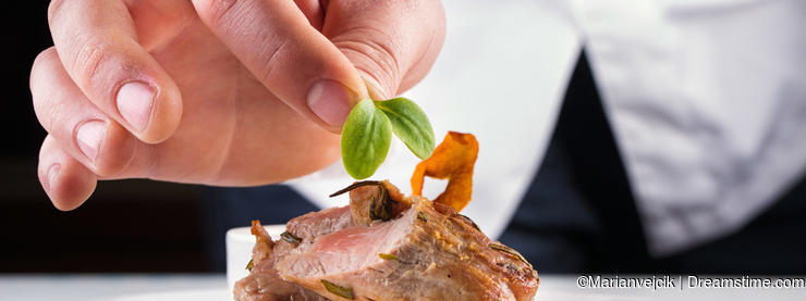 Chef in hotel or restaurant kitchen cooking, only hands. Prepared meat steak with potato or celery pancakes.