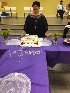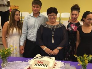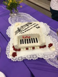 Immediately after the Music Tribute refreshments were served in the church hall where a beautiful cake made into a piano complete with keys and bearing Kathy’s name was cut by Kathy flanked by her family.