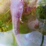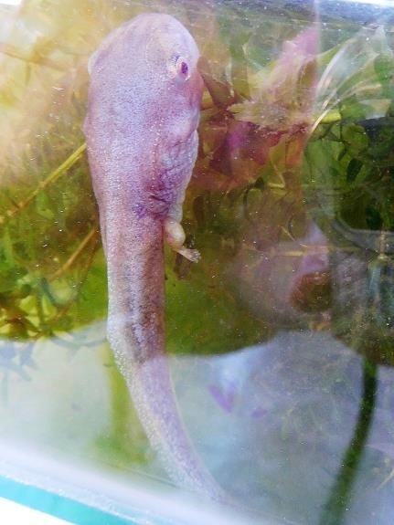 Only two specimens of this large tadpole survive, and now they have developed back legs, and are showing signs of front limbs.