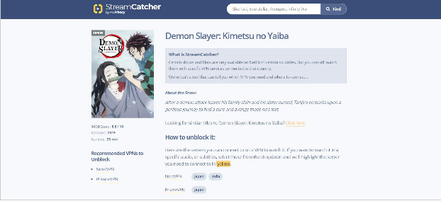 For example, StreamCatcher accurately told us that to unblock Demon Slayer, we needed to use a Japanese or Indian server from NordVPN, or a Japanese server from PrivateVPN.