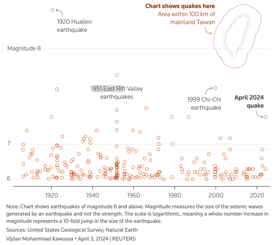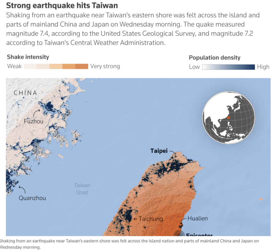 A strong earthquake that hit Taiwan on Wednesday and measured magnitude 7.4, according to the United States Geological Survey, was the strongest to hit the island in about 25 years.