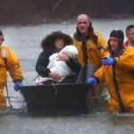 An emergency worker held a crying baby rescued with her mother from a flooded home on Post Island Road in Quincy. (John Tlumacki/Globe Staff)