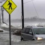A cars drove through flooded East Squantum Street in Quincy during the March 2 storm. (Stan Grossfeld/ Globe Staff)