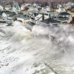 Waves continued to crash into houses along Oceanside Drive in Scituate during high tide, days after Friday’s storm. (Aram Boghosian for The Boston Globe)