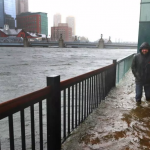 A man walked through a flooded sidewalk off Congress Street, where water was flowing over from Fort Point Channel in the Seaport district on March 2. (John Tlumacki/Globe Staff)