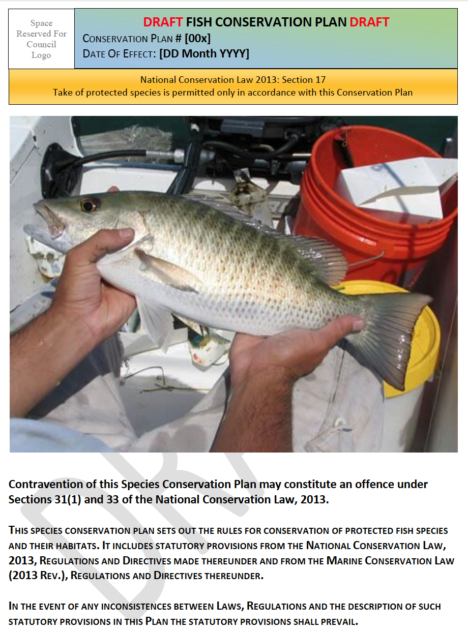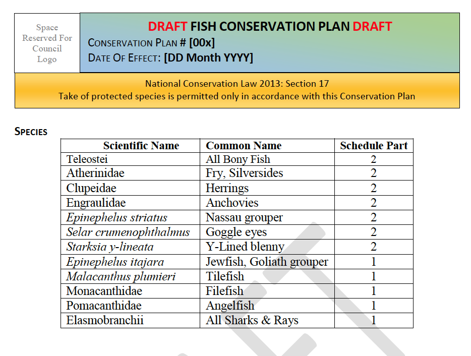 the Council passed an interim directive to allow them to do so. “The take of any of the fish species listed in Schedule 1 Part 1 and Part 2 of the National Conservation Law, 2013 with a spear gun, seine net, gill net or fish pot is prohibited without a licence.”