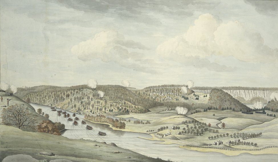 At the time, New York City (then known as New Amsterdam) featured rolling hills, forests, boulders, farms, and spaced-out homes. This 1776 illustration is of present-day University Heights in the Bronx.