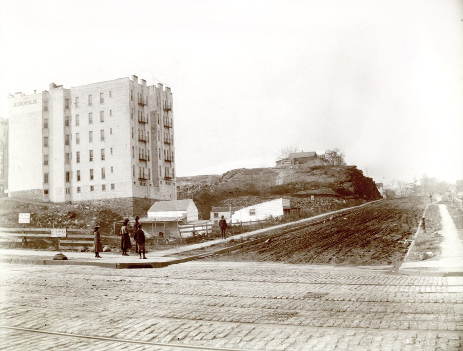 The newly graded streets attracted residents to upper parts of Manhattan. Within two decades, apartment buildings replaced the farmhouses in this 1898 photo.