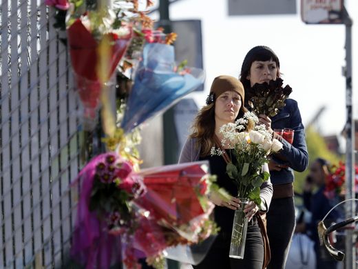 Well-wishers walk to place flowers at the scene in the aftermath Dec. 4, 2016, of a warehouse fire in Oakland. Marcio Jose Sanchez, AP