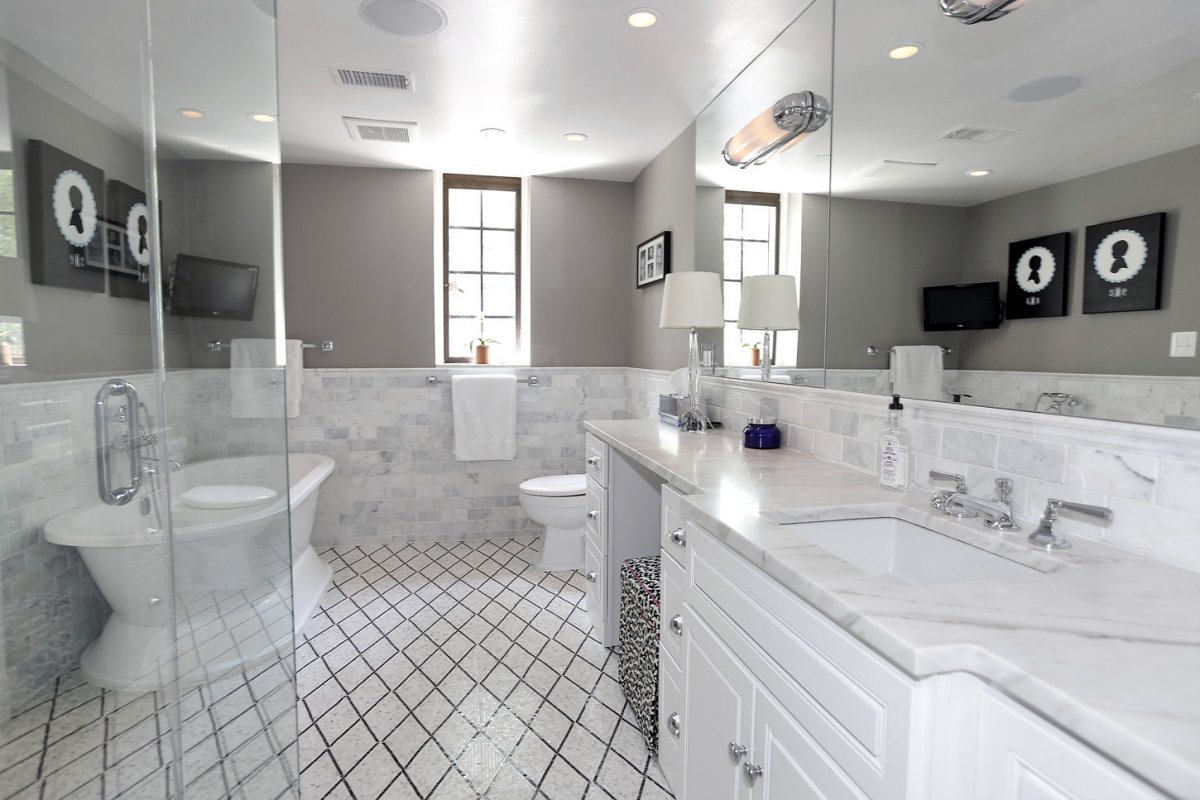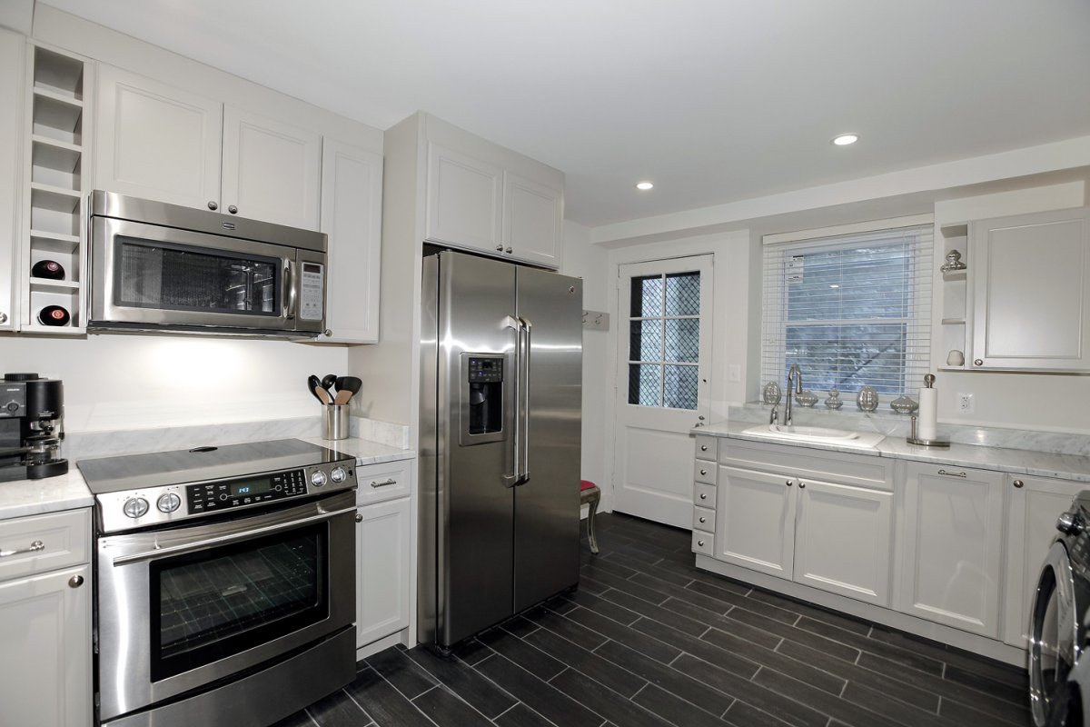 The kitchen is bright and updated, with marble countertops and luxury appliances.