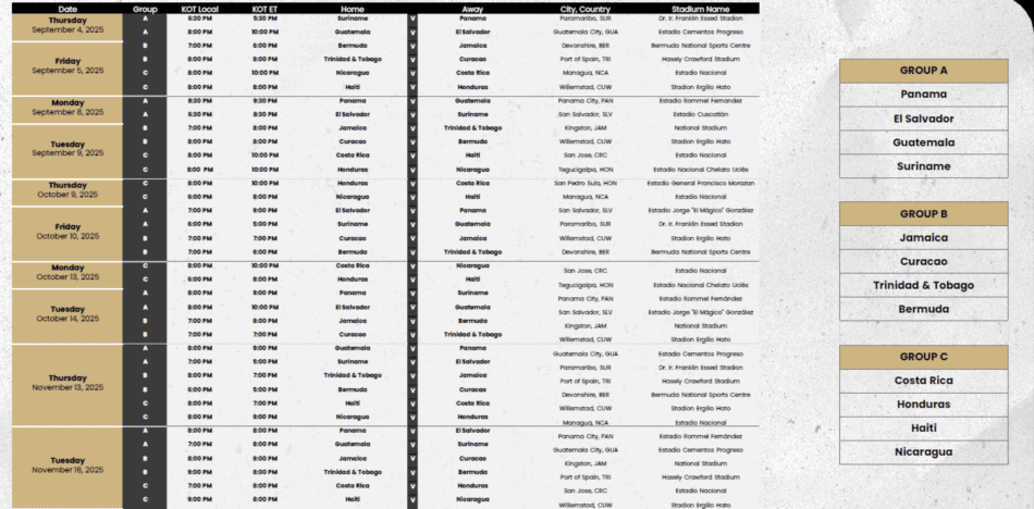 Miami, FL (Thursday, August 28, 2025) – Concacaf has confirmed the venues and kick-off times for the October and November matches in the Final Round of Men’s World Cup Qualifying for the FIFA World Cup 2026.