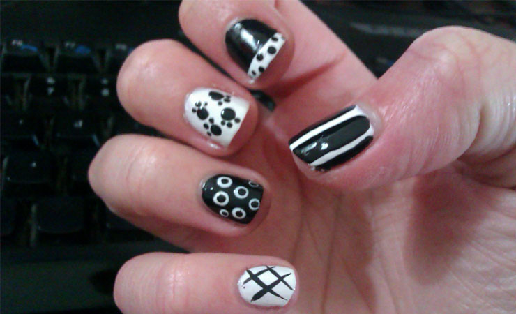 If you are going to attend a musical concert, then leave searching more stylish nail designs. This cool nail ensemble will show the world how much you are a music enthusiast. Polish your nails with white nail polish. As it dry, take a striping brush, dip it into black nail polish and draw musical patterns on three or four fingers. Apply one coat of shimmery silver nail polish on pointer finger to get a strong statement.