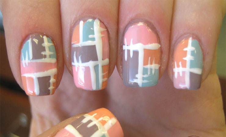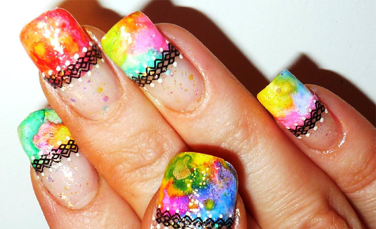 For a fine and artistic nail ensemble, try this glam idea from the repertoire of cool nail designs. Color your nails with snowy white nail polish and allow it to dry. Now put some drops of grey, pink and purple nail lacquers on a palate, dip a cotton swab respectively into these nail polishes and gently touch your nails with it entirely covering the white background. What you get is an outstanding blurred yet colorful nail design popping you out in a gathering.