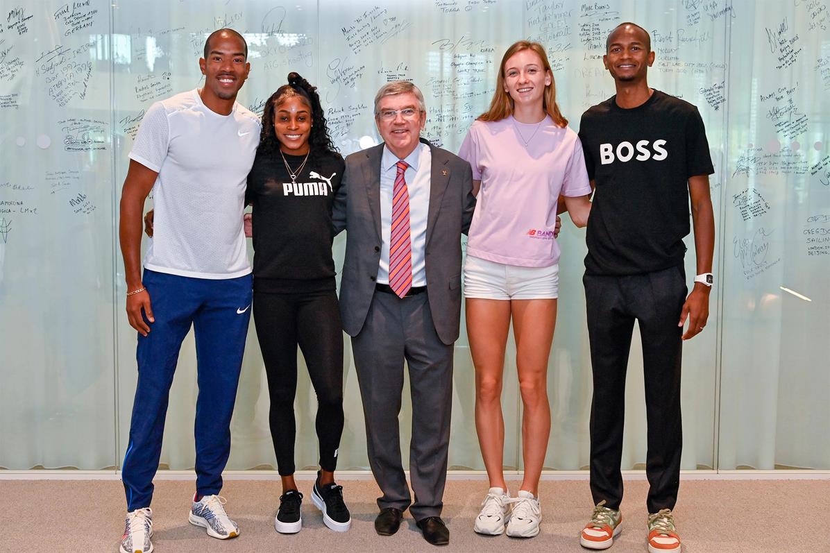 24 Aug 2022 – Olympic champions and Olympic medallists set to compete this week at Athletissima, the traditional Lausanne track and field meeting of the Diamond League, were welcomed today by International Olympic Committee (IOC) President and Olympic champion Thomas Bach to Olympic House. The IOC headquarters in the Olympic capital in Switzerland is recognised as one of the most sustainable buildings in the world.