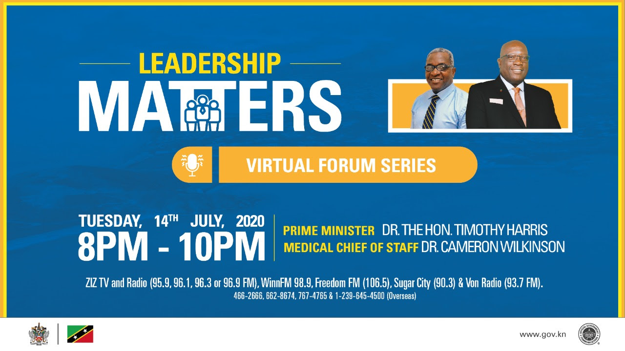 July 14th, 2020 The St. Kitts-Nevis Government’s widely watched Leadership Matters virtual forum series will air tonight, Tuesday, July 14th, 2020 with Prime Minister Dr. the Honourable Timothy Harris headlining its 12th installment on ZIZ TV (Channel 5 or https://zizonline.com/tv/channel-5/) from 8:00pm to 10:00pm.