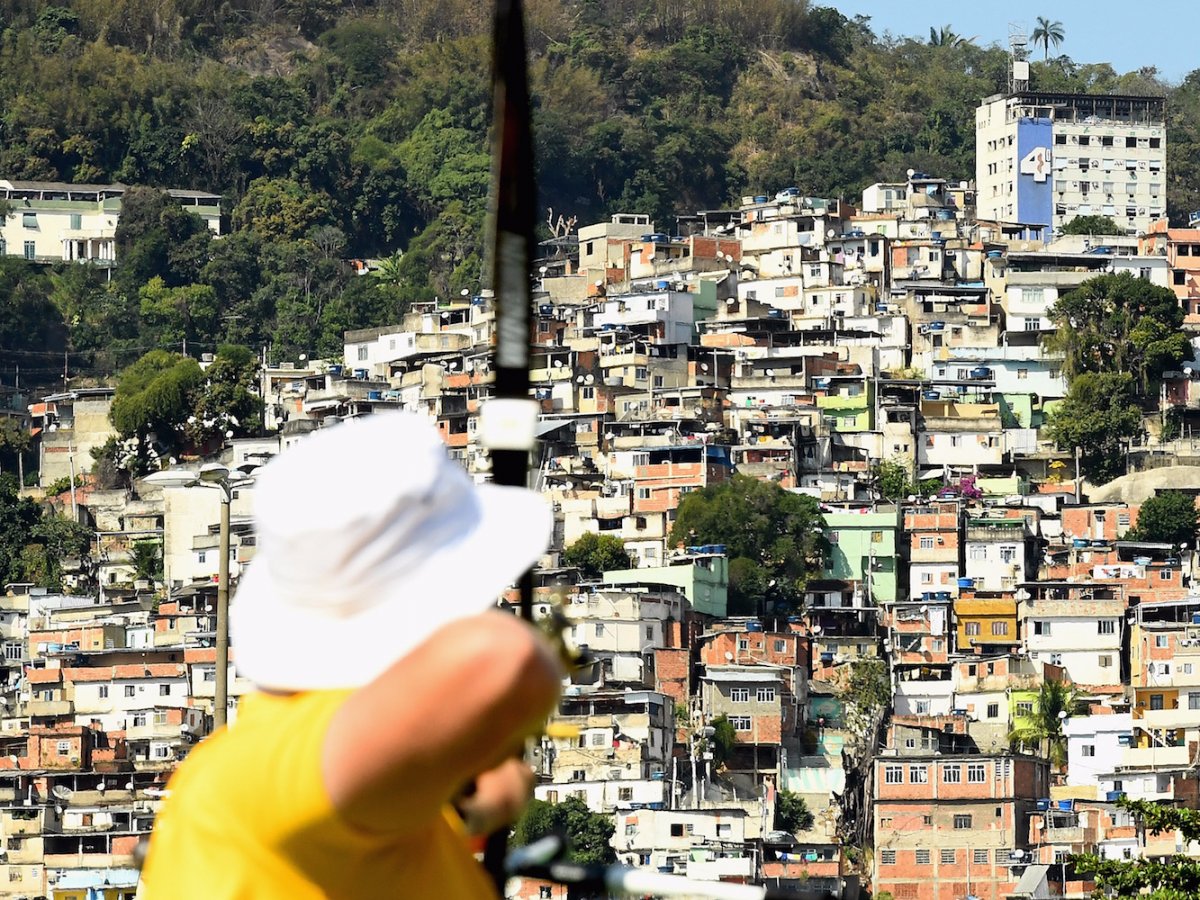 An Australian archer takes aim with a Rio favela in the background.