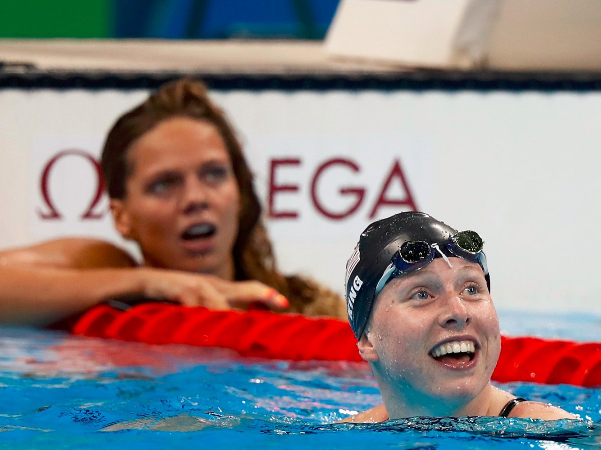 Different reactions from USA’s Lilly King and Russia’s Yulia Efimova as they look at their times.