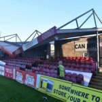 Strong winds of up to 70mph (112km/h) wreaked havoc in Cumbria on Monday night, damaging the roof of Barrow AFC’s stadium and forcing police to close roads in the town.