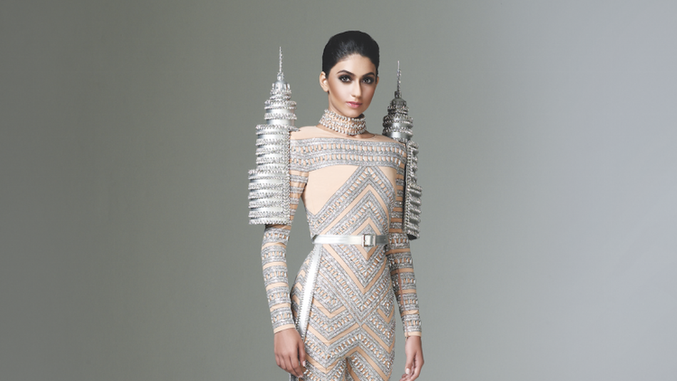 Kiran Jassal’s costume features the country’s iconic twin towers in Kuala Lumpur, and has more than 100,000 Swarovski crystal sewn into the silver and nude piece.
