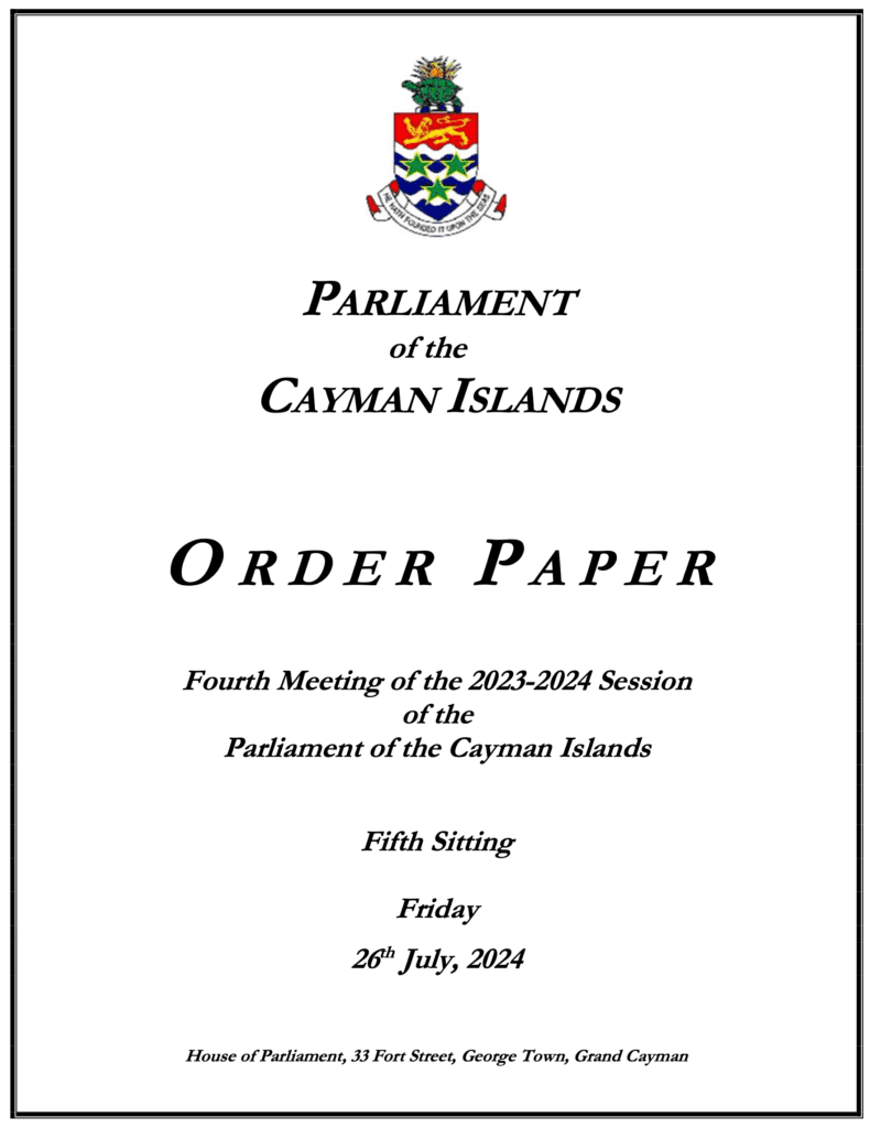 Parliament of the Cayman Islands Fourth Meeting 5th Sitting Order Paper, Friday 26 July