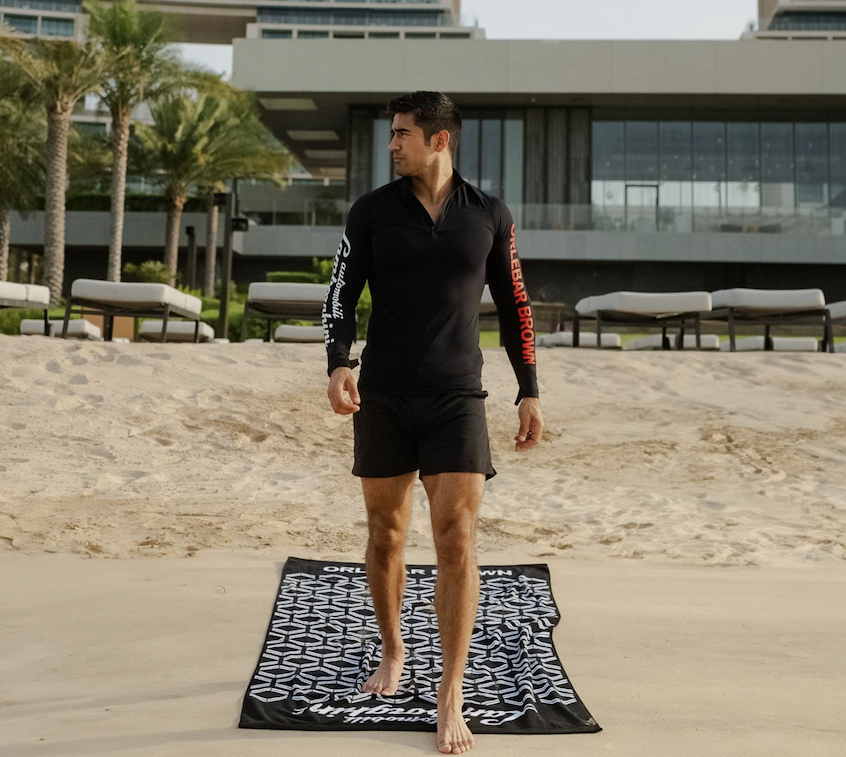 The hex design is interpreted onto a signature on polo shirts and t-shirts as well as a technically beautiful Howell two-tone towelling resort shirt. The same design is applied to the beach towel, rounding out the capsule.