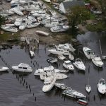 Boats are stacked up on each other in a marina as a result from Florence in New Bern, North Carolina.