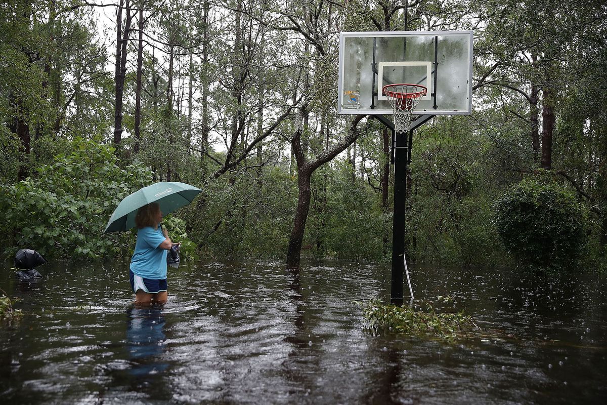 Kim Adams wades through waist-deep floodwaters at her home in Southport, North Carolina.