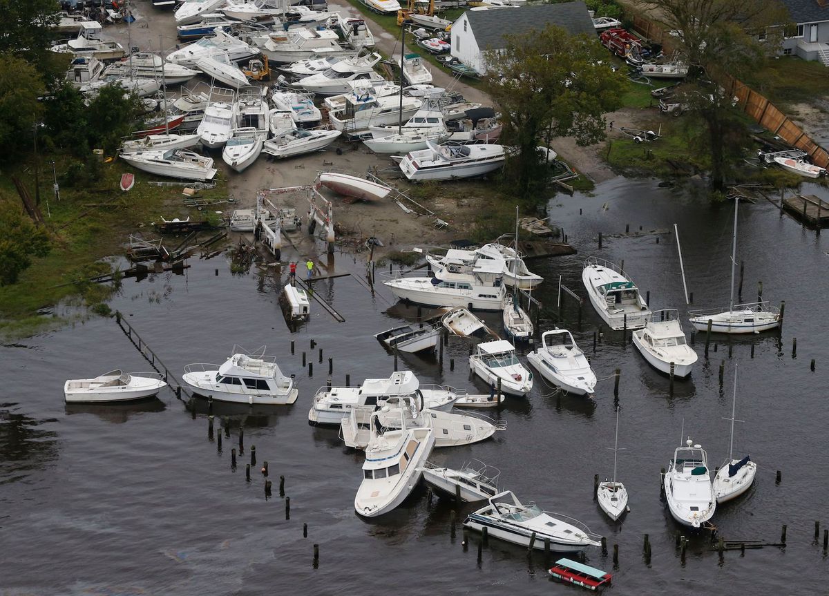 Boats are stacked up on each other in a marina as a result from Florence in New Bern, North Carolina.