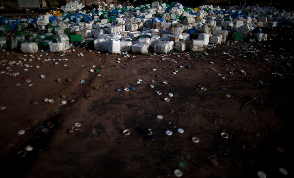 Empty agrochemical containers including Monsanto’s Round Up products lay discarded at a recycling center in Quimili, Santiago del Estero province, Argentina on May 2. Instead of a lighter chemical burden in Argentina, agrochemical spraying has increased ninefold, from 9 million gallons in 1990 to 84 million gallons today. Glyphosate, the key ingredient in Monsanto’s Round Up products, is used roughly eight to ten times more per acre than in the United States. Yet Argentina doesn’t apply national standards for farm chemicals, leaving rule-making to the provinces and enforcement to the municipalities. (Natacha Pisarenko/Associated Press)