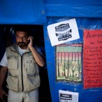 Activist Oscar Alfredo Di Vincensi talks on a cell phone inside his tent during his one-man hunger strike demanding that agrochemical spraying not be allowed within 1,000 meters of homes, in the main square of Alberti, in Buenos Aires province, Argentina on April 16. Earlier this year, Di Vincensi stood in a field waving a court order barring spraying within 1,000 meters of homes in his town of Alberti; a tractor driver doused him in pesticide. (Natacha Pisarenko/Associated Press)