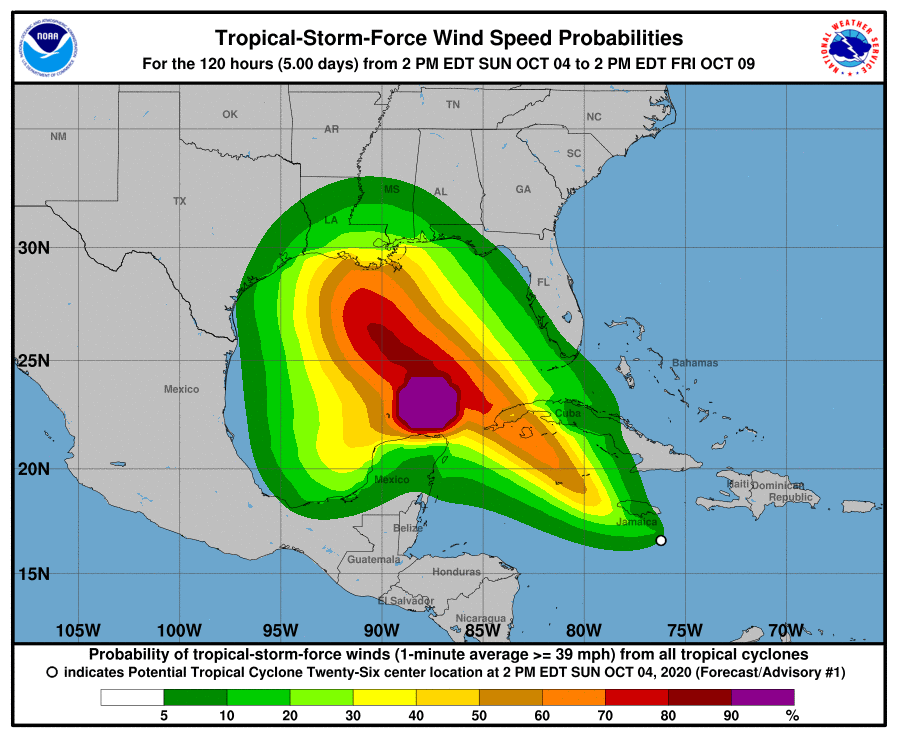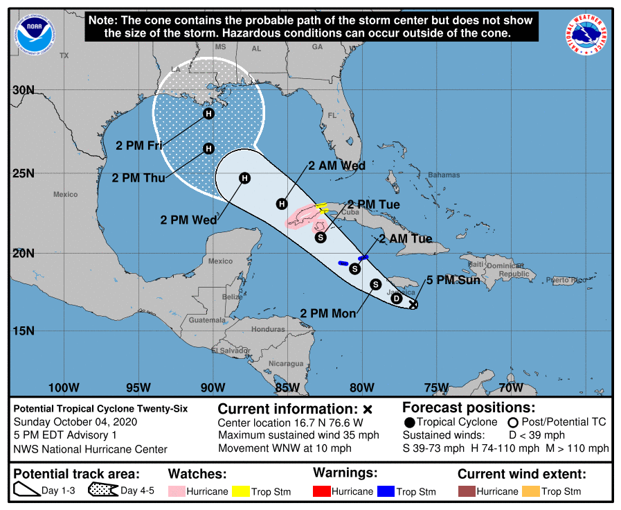 Visible satellite imagery and earlier scatterometer data indicated that the circulation associated with the area of low pressure in the central Caribbean Sea has gradually become better defined. The associated deep convection does not yet have enough organization to classify the system as a tropical depression, but there has been some increase in convection just south of the estimated center. The earlier ASCAT data revealed peak winds of around 30 kt over the northeastern portion of the circulation, and that is the basis for the initial intensity. The disturbance is located over warm waters and in a moist environment, but there is some modest northeasterly shear over the system. The global models indicate that the shear will decrease overnight, and the oceanic and atmospheric environment is expected to quite favorable for both the development of a tropical cyclone and subsequent strengthening of the system over the northwestern Caribbean Sea during the next couple of days. The intensity guidance is quite aggressive, but also assumes that the system already has a tropical cyclone structure. Therefore, the NHC intensity forecast is a little below the intensity consensus during the first 24-48 hours, but does show the system at or near hurricane strength by the time is near western Cuba on Tuesday. Environmental conditions are expected to remain favorable for strengthening over the southeastern Gulf of Mexico, and additional strengthening is predicted during that time. Late in the period, conditions are forecast to become less conducive as the vertical wind shear increases and the system nears the cooler shelf waters of the northern Gulf of Mexico. The disturbance is moving west-northwestward or 290/9 kt. A mid- to upper-level ridge over the western Atlantic is forecast to build westward over the next few days, which should continue to steer the system west-northwestward to northwestward over the northwestern Caribbean Sea and southeastern Gulf of Mexico. The forward speed of the system is likely to increase in 48 to 72 hours while it moves between the ridge and Tropical Storm Gamma to its southwest. After 72 hours, the cyclone is forecast to slow down and turn northward around the western portion of the ridge and a mid- to upper-level trough over the south-central United States. The track guidance is in relatively good agreement during the first 48 to 72 hours, but there is increasing spread thereafter. Users are reminded that the average 4- and 5-day NHC track forecast errors are about 160 to 200 miles at those time periods. Key Messages: 1. Tropical storm conditions are expected in the Cayman Islands beginning late Monday, and a Tropical Storm Warning is in effect. 2. Dangerous storm surge and hurricane conditions are possible in portions of western Cuba and the Isle of Youth by Tuesday afternoon, and a Hurricane Watch is in effect. 3. Heavy rainfall will affect portions of Hispaniola, Jamaica, the Cayman Islands, and western Cuba during the next few days and could lead to life-threatening flash floods and mudslides. 4. The system is forecast to approach the northern Gulf Coast late this week as a hurricane. While there is large uncertainty in the track and intensity forecasts at these time ranges, there is a risk of dangerous storm surge, wind, and rainfall hazards along the coast from Louisiana to the western Florida Panhandle. Residents in these areas should monitor the progress of the system and check for updates to the forecast during the week. FORECAST POSITIONS AND MAX WINDS INIT 04/2100Z 16.7N 76.6W 30 KT 35 MPH...POTENTIAL TROP CYCLONE 12H 05/0600Z 17.1N 77.7W 30 KT 35 MPH...TROPICAL DEPRESSION 24H 05/1800Z 18.0N 79.1W 35 KT 40 MPH 36H 06/0600Z 19.0N 80.5W 45 KT 50 MPH 48H 06/1800Z 21.0N 82.8W 60 KT 70 MPH 60H 07/0600Z 23.1N 85.4W 70 KT 80 MPH 72H 07/1800Z 24.7N 87.9W 80 KT 90 MPH 96H 08/1800Z 26.5N 90.3W 85 KT 100 MPH 120H 09/1800Z 28.6N 90.3W 85 KT 100 MPH $$ Forecaster Brown