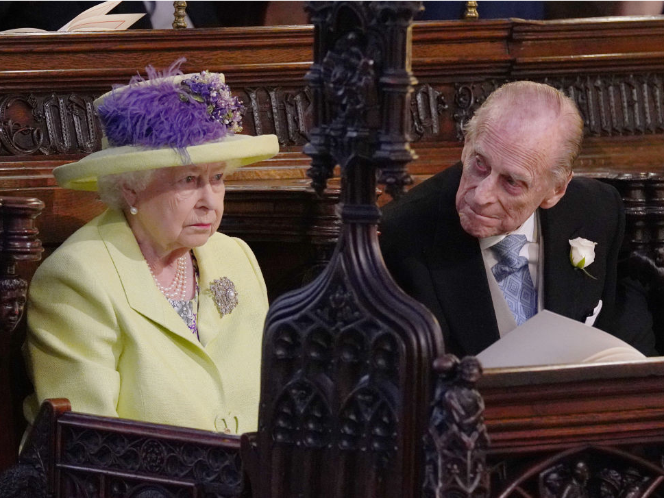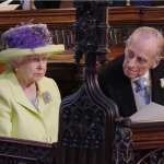 …While the Queen and Prince Philip seemed a little more stern. The Queen, in line with protocol, was the last to arrive at the chapel before Meghan. She wore a lime green outfit.