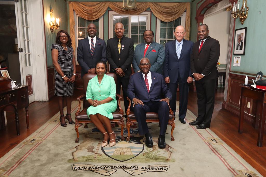 - Group Photo, standing left to right: Mrs Rosa Greenaway, Permanent Secretary, Ministry of Education, Sports and the Creative Industries, Antigua and Barbuda, the Honourable Daryll Matthew, Minister of Education, Sports and the Creative Industries, Antigua and Barbuda; Professor Sir Hilary Beckles, Honouree and Vice-Chancellor, The UWI the Honourbale Steadroy Benjamin, Prime Minister Ag. and Attorney General; Mr. Aziz Hadeed, Chair of The UWI Five Islands Campus Council and Professor Densil Williams, Pro Vice-Chancellor and Campus Principal, The UWI Five Islands. Seated are Her Excellency Sandra, Lady Williams, The Governor General’s Goodwill Emissary, His Excellency Sir Rodney Williams, Governor General of Antigua and Barbuda
