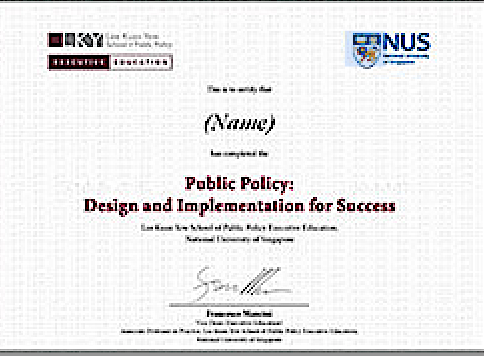| Upon successful completion of the programme, participants will be awarded a digital Certificate of Completion by Lee Kuan Yew School of Public Policy Executive Education, National University of Singapore. |