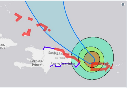 The National Hurricane Center reports that the center of the hurricane was detected “just offshore” the northwest coast of Puerto Rico around 2pm ET. It will move away from the coast this afternoon, according to the NHC.