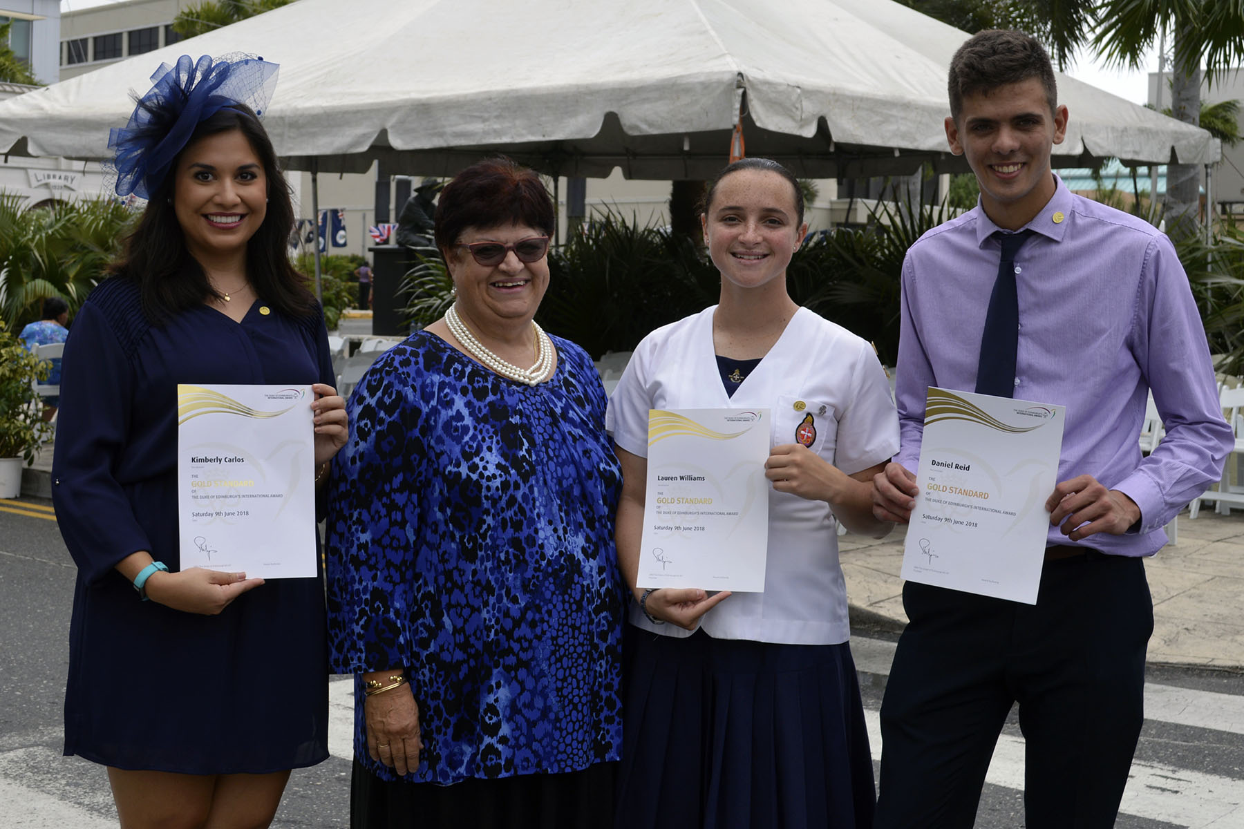 7. Ms. Katherine Jackson (second from the left) stands alongside the Duke of Edinburgh’s Gold Award recipients (l-r) Kimberly Carlos, Lauren Williams and Daniel Reid.