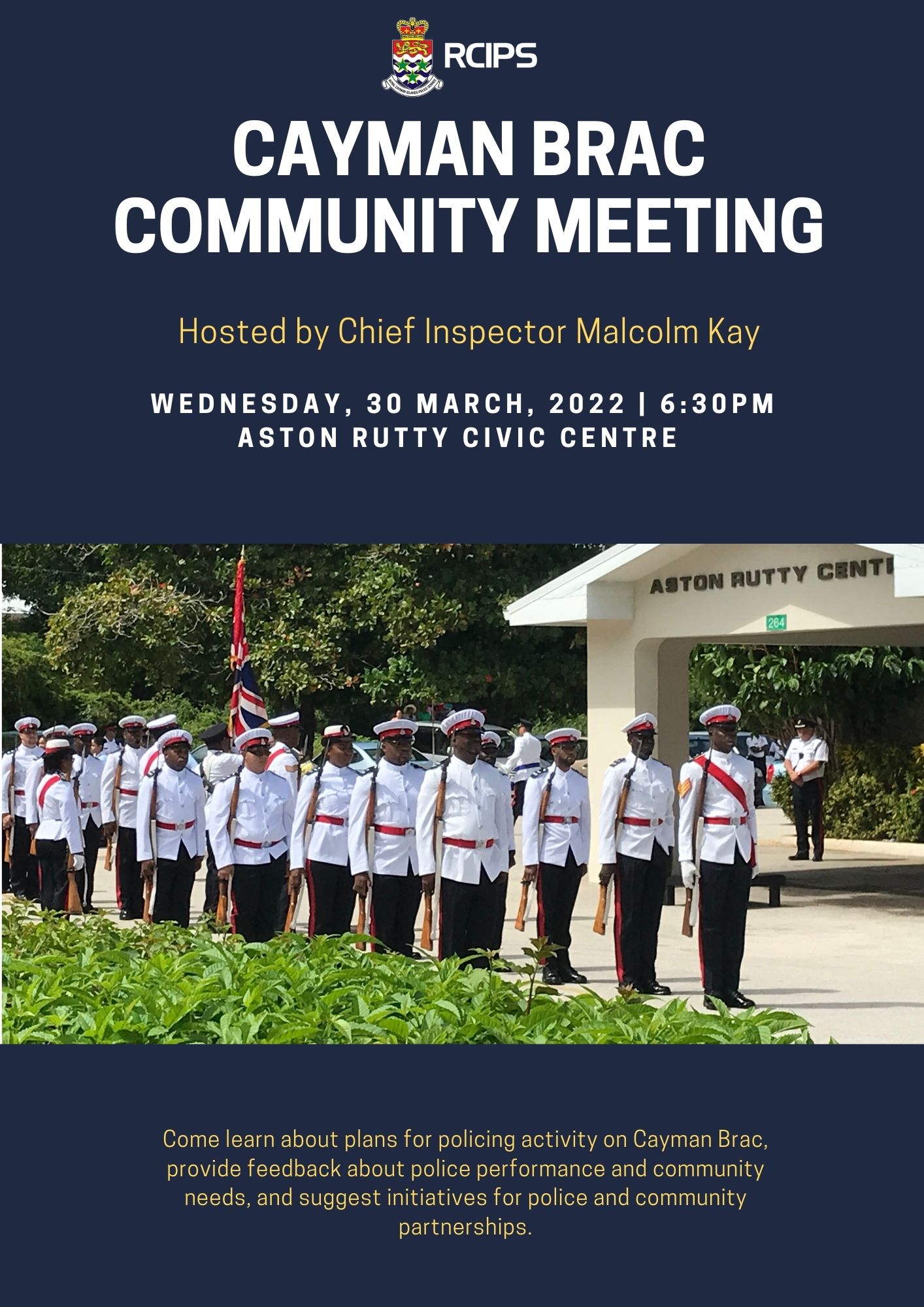 On Wednesday 30 March, from 6:30PM the RCIPS will be hosting a community meeting at the Aston Rutty Centre in Cayman Brac.