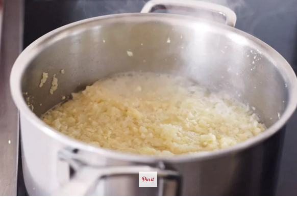 Finely chop the cauliflower (for whole cauliflower only): Halve the cauliflower through the stem. Cut a “V” shape around the core to remove the core from each half. Finely chop the cauliflower. The smaller the pieces, the faster the cauliflower will cook and the creamier the finished dish will be.