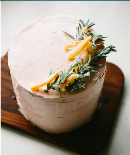 Brush the cake layers with the remaining blood orange reduction. Frost the cake then garnish with the candied blood orange peel.