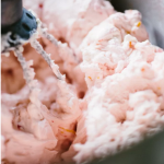 Once the buttercream is smooth and glossy turn the mixer down to low then stir in 1/4 cup of the cooled reduced blood orange juice. Stir in the zest and salt.