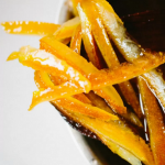 Bring a saucepan of water to boil then add the orange peels to the pot. Simmer for 30 seconds. Drain then run the peels under cold water.